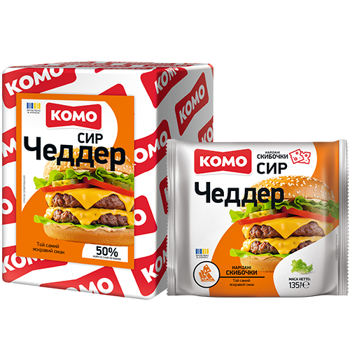 Чеддер від КОМО — твердий сир із насиченим смаком і впізнаваним яскравим помаранчевим кольором. Він має щільну текстуру та виразний вершковий аромат, який розкривається з кожним шматочком. Ідеально підходить для бутербродів, перекусів і гарячих страв. Добре плавиться, додаючи стравам апетитного вигляду та пікатного смаку.